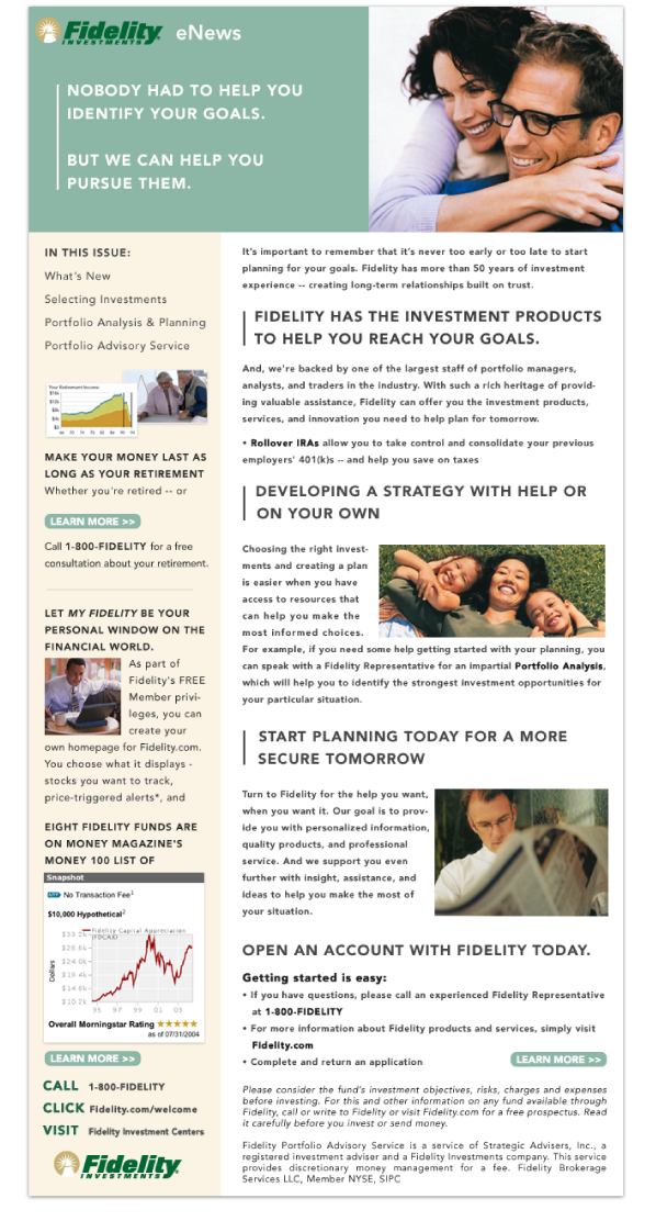 ClientFidelity Investments Inc. is an American multinational financial services corporation based in Boston, Massachusetts. Fidelity Investments operates a brokerage firm, manages a large family of mutual funds, provides fund distribution and investment advice, retirement services, index funds, wealth management, cryptocurrency, securities execution and clearance, asset custody, and life insurance. Project TypeEmail campaign. |