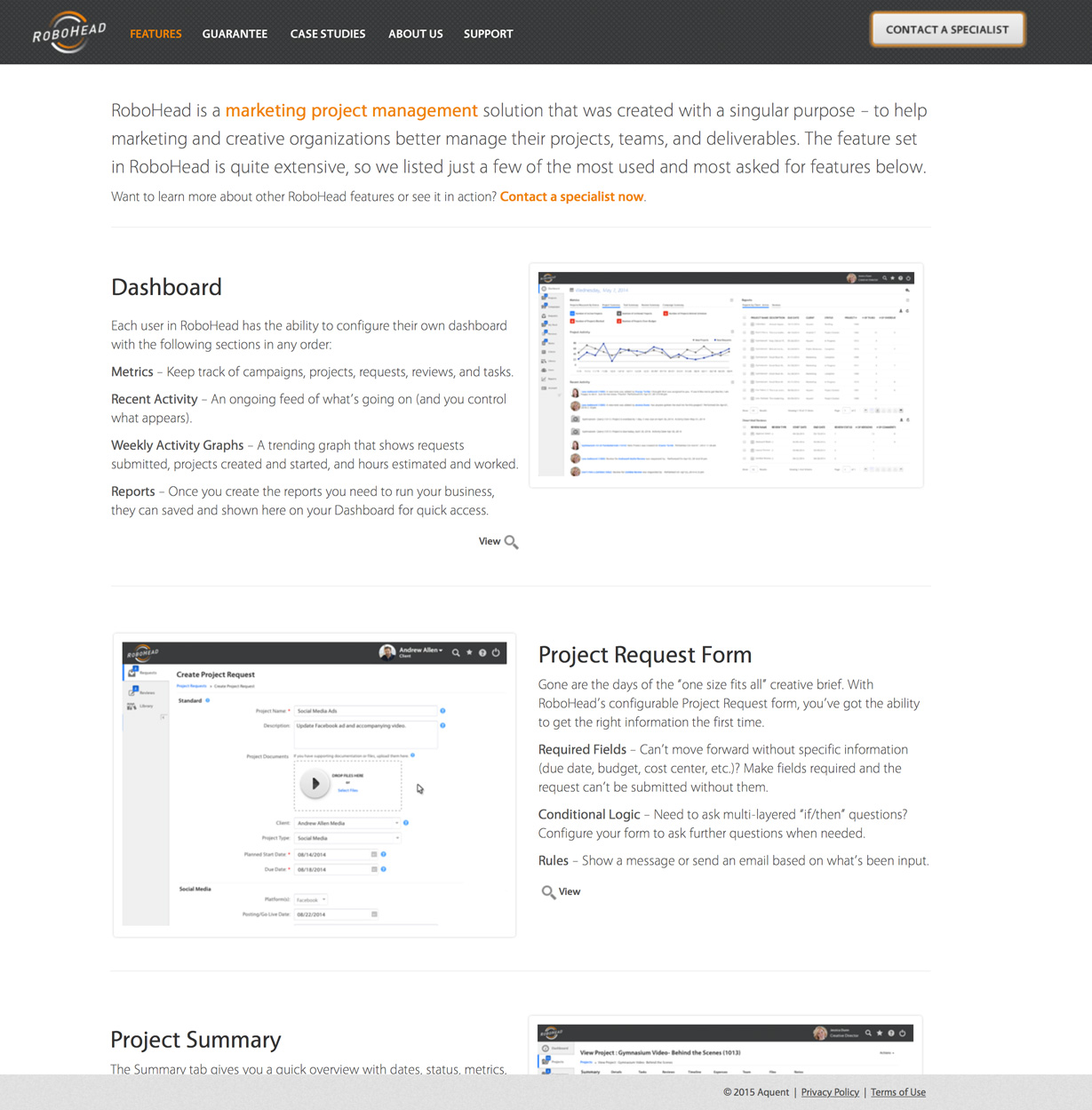 Aquent Cloud's RoboHead is a web-based project management software solution designed for marketing and creative professionals. Designed to be easy-to-learn and quick-to-implement software to solve the day-to-day challenges of project managers, graphic designers, marketing directors, creative directors, and others on the team. Everything needed to create awesome work is in one place: schedules, budgets, deliverables, approvals, reports, assets and more. Get more work done in less time while delivering projects on schedule and budget, the result is happy and satisfied clients. Project TypeWebsite Design & Development |